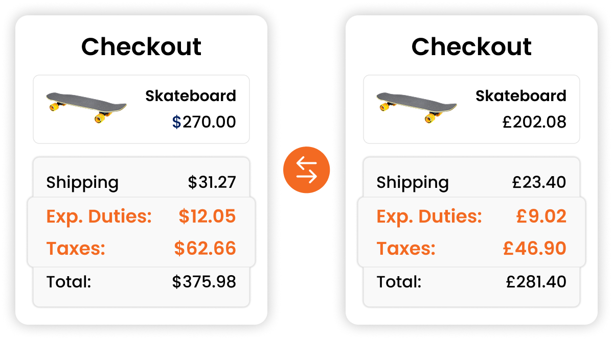 To further reduce the uncertainty for the buyer, the duties and taxes, in fact the entire checkout, can be switched into the buyer’s local currency, which eliminates the risk of the exchange rate working against the buyer and therefore, lets the buyer make an informed choice based on the known financial cost of the goods. EdgeTariff lets you switch-on foreign exchange (FX) rates, so the entire checkout, including the duties and taxes, is shown in the buyer’s local currency (based on their browser’s internet location). For example, a UK store visitor can see product prices, cart content and checkout total landed cost in GBP (Pounds Sterling), which gives the UK buyer complete confidence that the price they pay, is the only payment they will need to make, and they’ll now just simply get the goods, i.e., makes it as simple as making a local purchase for them.