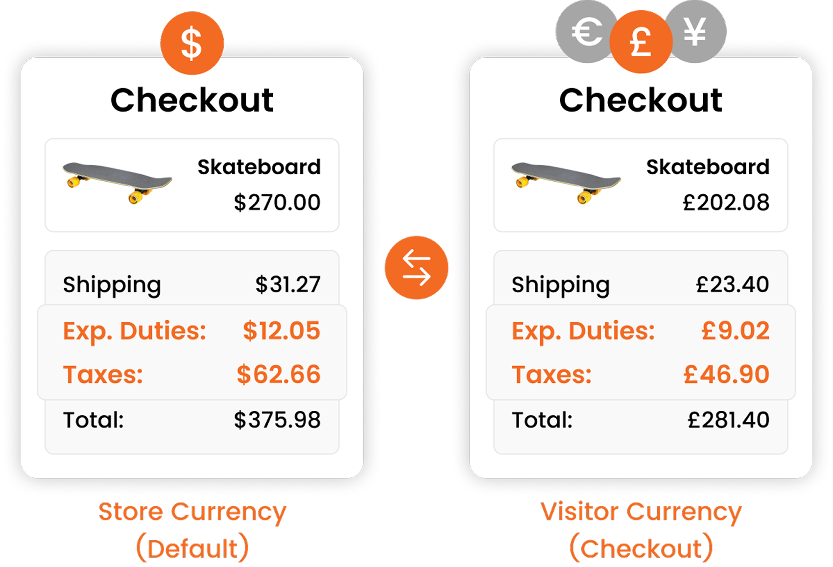 Remember confident buyers, buy more, so give your overseas store visitors the confidence to buy by show all the financials on the checkout in their local currency.