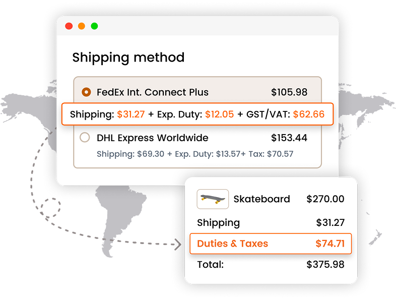 Auto-detect overseas buyers and showing the checkout total landed cost in their local currency, using live FX rates from 170 currencies.