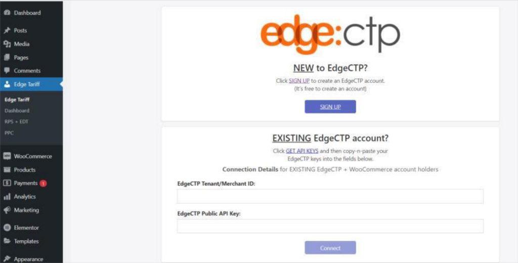 3. Login to your WooCommerce store and in the left menu, click on EdgeTariff and add/paste the connection keys from EdgeCTP into the EdgeCTP Tenant/Merchant ID and