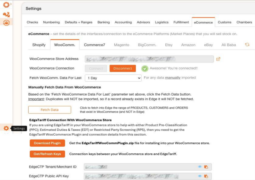 4. Connected your WooCommerce store to EdgeCTP (i.e., Settings > eCommerce > WooComm.) and set the relevant store connection details.