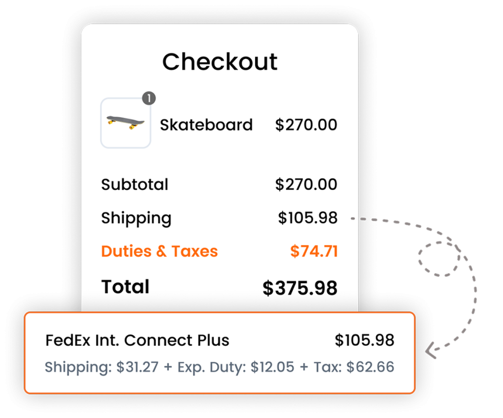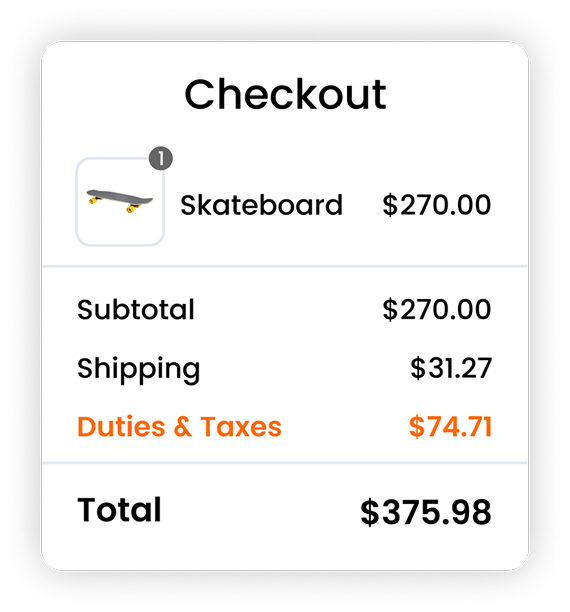 EdgeTariff shows to overseas buyer the cost of goods, shipping rates, duties and taxes, which summed together is the Total Landed Cost (TLC), on the checkout. This transparency on the checkout allows the buyer to make an informed decision BEFORE making the purchase. As a result, buyer’s remorse is eliminated from a price point of view, which encourage sales, and repeat purchases increase because the uncertainty of duties and taxes is removed.