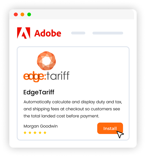 Search “EdgeTariff” in the Adobe Commerce Extensions, select Add to cart and Install it. Free to get and no development required.
